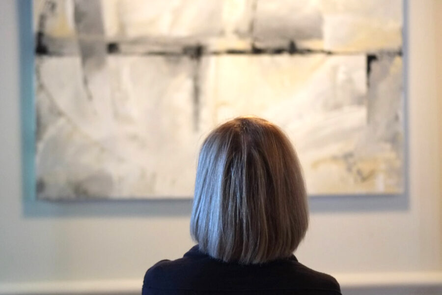 Le vernissage de son exposition « États d’âme » a eu lieu jeudi dernier dans une atmosphère de retrouvailles. Membres de sa famille, amis et collègues de travail se sont rassemblés pour l’occasion — dans le respect des règles sanitaires, bien entendu! L’aménagement de l’espace permettait à tous de circuler librement pour regarder les toiles, renouer avec d’anciennes connaissances ou faire de belles rencontres.