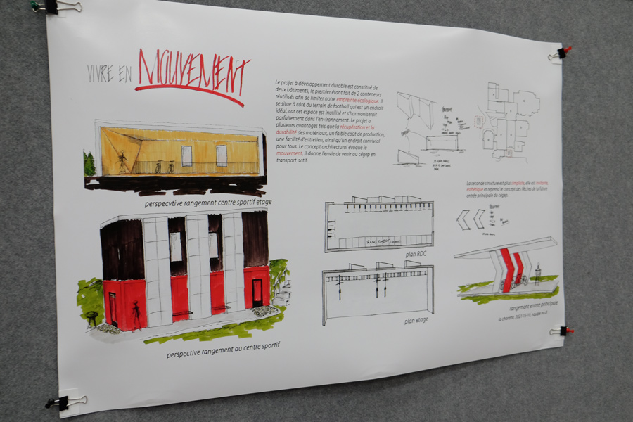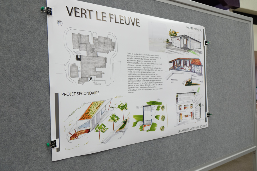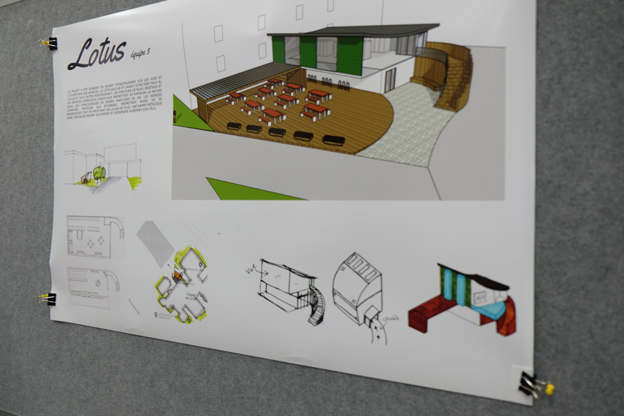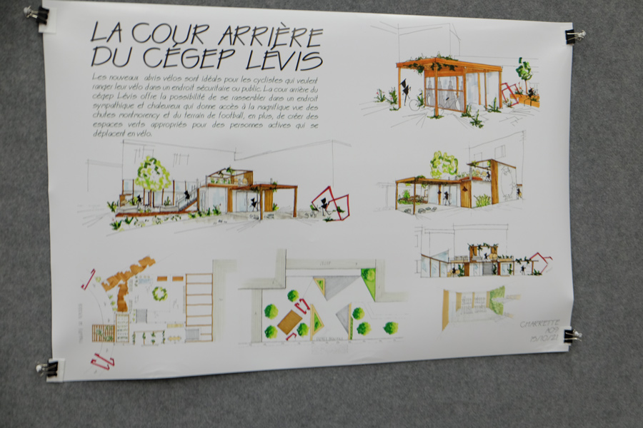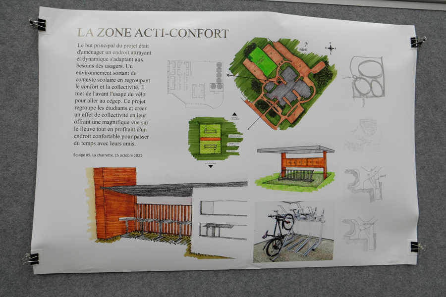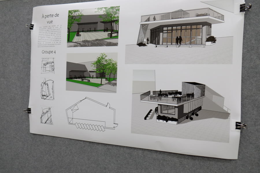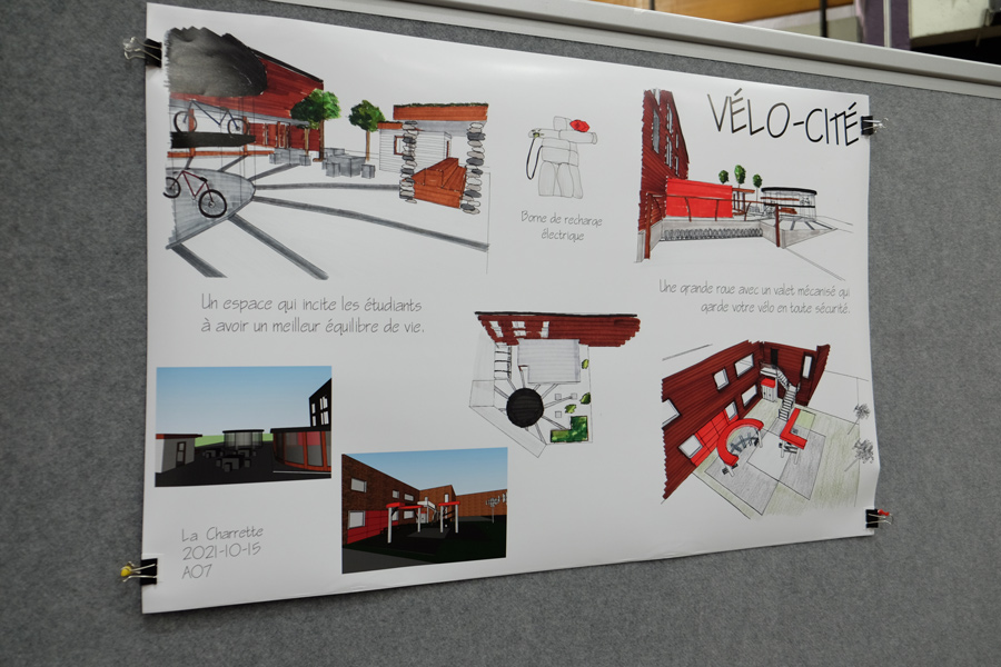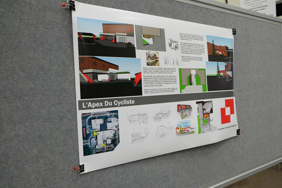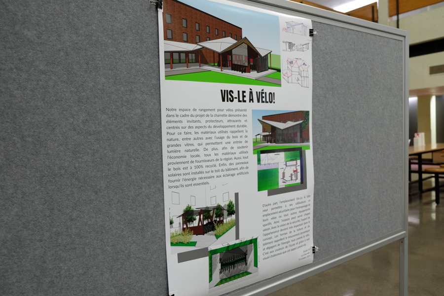 Sur leur planche à dessin, les étudiants devaient aussi prévoir la signalisation, des voies d’accès sécuritaires et des rampes d’accès. Ils devaient présenter leur concept sur une affiche de 24 X 36 pouces.