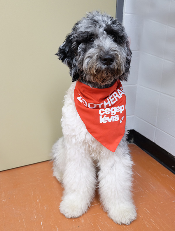 Plume est une Aussiedoodle, race née du croisement entre le berger australien et le caniche. C’est une « chienne velcro » comme le dit sa maîtresse, Caroline Thouin, technicienne en travaux pratiques au Département de soins infirmiers. Celle-ci s’intéresse à la zoothérapie depuis longtemps et tout récemment, elle a décidé de pousser plus loin son engagement envers les étudiants en suivant une formation à l’Institut de zoothérapie du Québec, puis en entreprenant des démarches pour adopter un chien.